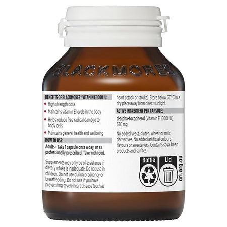BLACKMORES VITAMIN E 1000 IU maintains vitamin E levels in the body and helps reduce free radical damage to body cells.