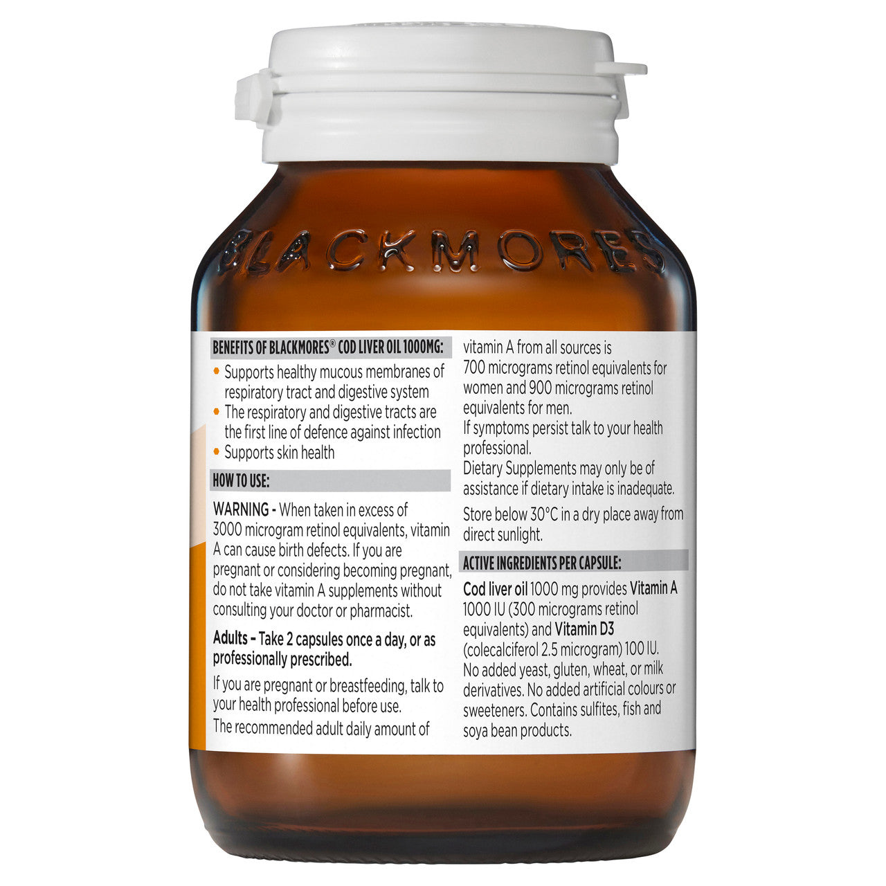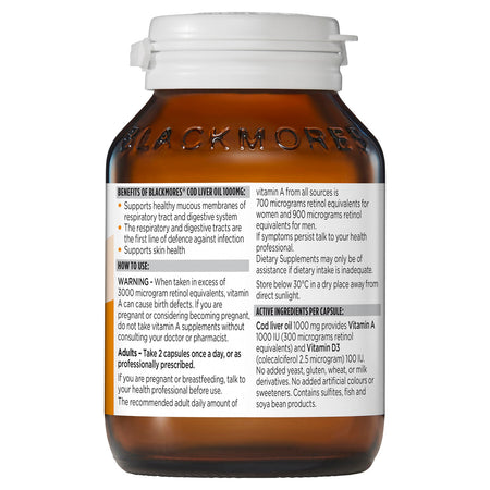 Blackmores Cod Liver Oil 1000mg is a source of vitamins A and D and omega-3 fatty acids. Vitamin A helps to support a healthy immune system, and vitamin D is essential for calcium absorption.