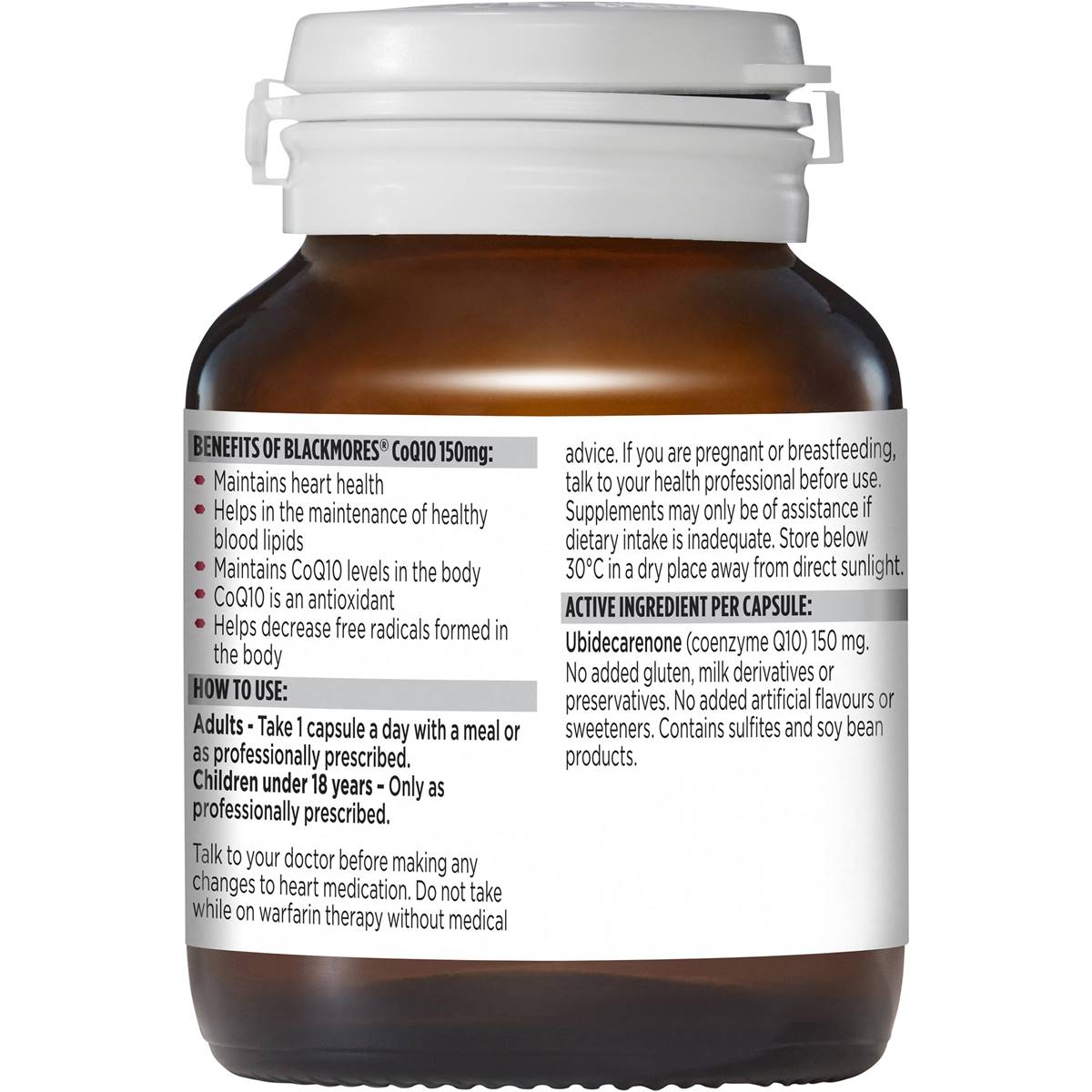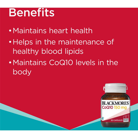 Blackmores CoQ10 150mg contains a potent dose of coenzyme Q10 (CoQ10), an antioxidant enzyme that is found naturally concentrated in the heart muscle. CoQ10 150mg helps maintain heart health, promotes blood vessel health and helps maintain healthy blood lipids.Â