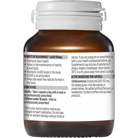 Blackmores CoQ10 150mg contains a potent dose of coenzyme Q10 (CoQ10), an antioxidant enzyme that is found naturally concentrated in the heart muscle. CoQ10 150mg helps maintain heart health, promotes blood vessel health and helps maintain healthy blood lipids.Â