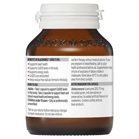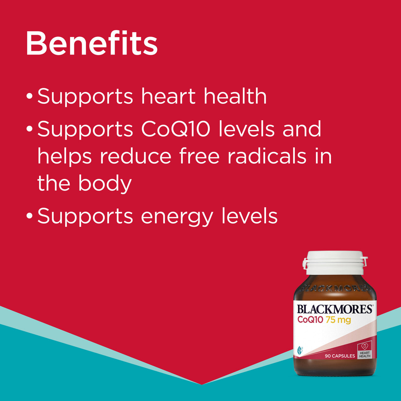 Blackmores CoQ10 75mg contains coenzyme Q10 (CoQ10), an antioxidant which maintains heart health and promotes blood vessel health.
