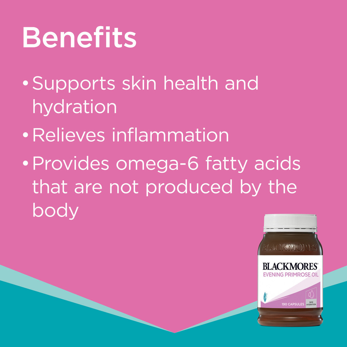 Blackmores Evening Primrose Oil is a natural source of omega-6 fatty acids, which can help to support skin health and hydration.