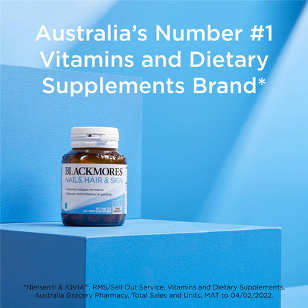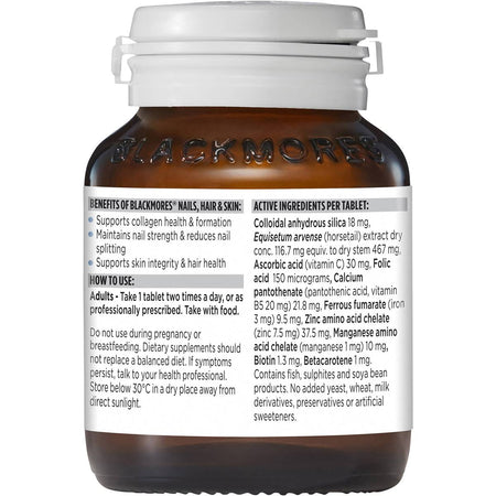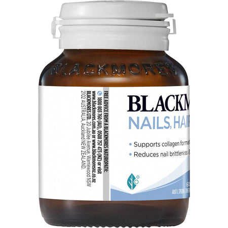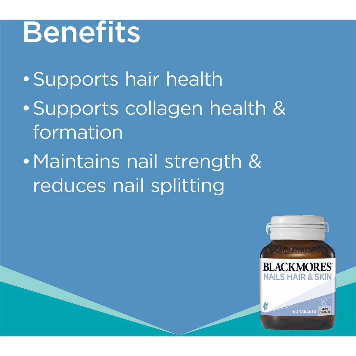 Blackmores Nails, Hair & Skin is a comprehensive formula that provides essential nutrients for healthy nails, hair and skin. It supports collagen formation and reduces nail brittleness & splitting.- Supports collagen health & formation.