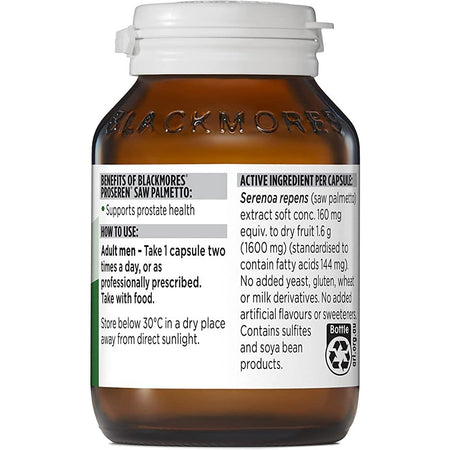 Blackmores Proseren® Saw Palmetto with Serenoa repeans is traditionally used in western herbal medicine for the symptomatic relief of mild prostate complaints such as frequent urination, weak or interrupted urinary flow, or the feeling of not being able to empty the bladder completely. Helping you to support healthy prostate function, in an easy-to-swallow capsule. Contains a standardised extract of saw palmetto.Size: 120 capsules.