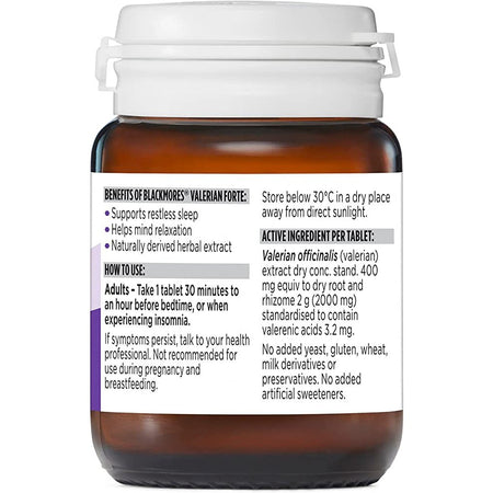 BLACKMORES VALERIAN FORTE is a one-a-day dose of valerian which is traditionally used in Western Herbal medicine to help reduce time to fall asleep and supports refreshing sleep. It also reduces restless sleep and helps mind relaxation.Boxed Contents: Brown capsule-shaped tablet.