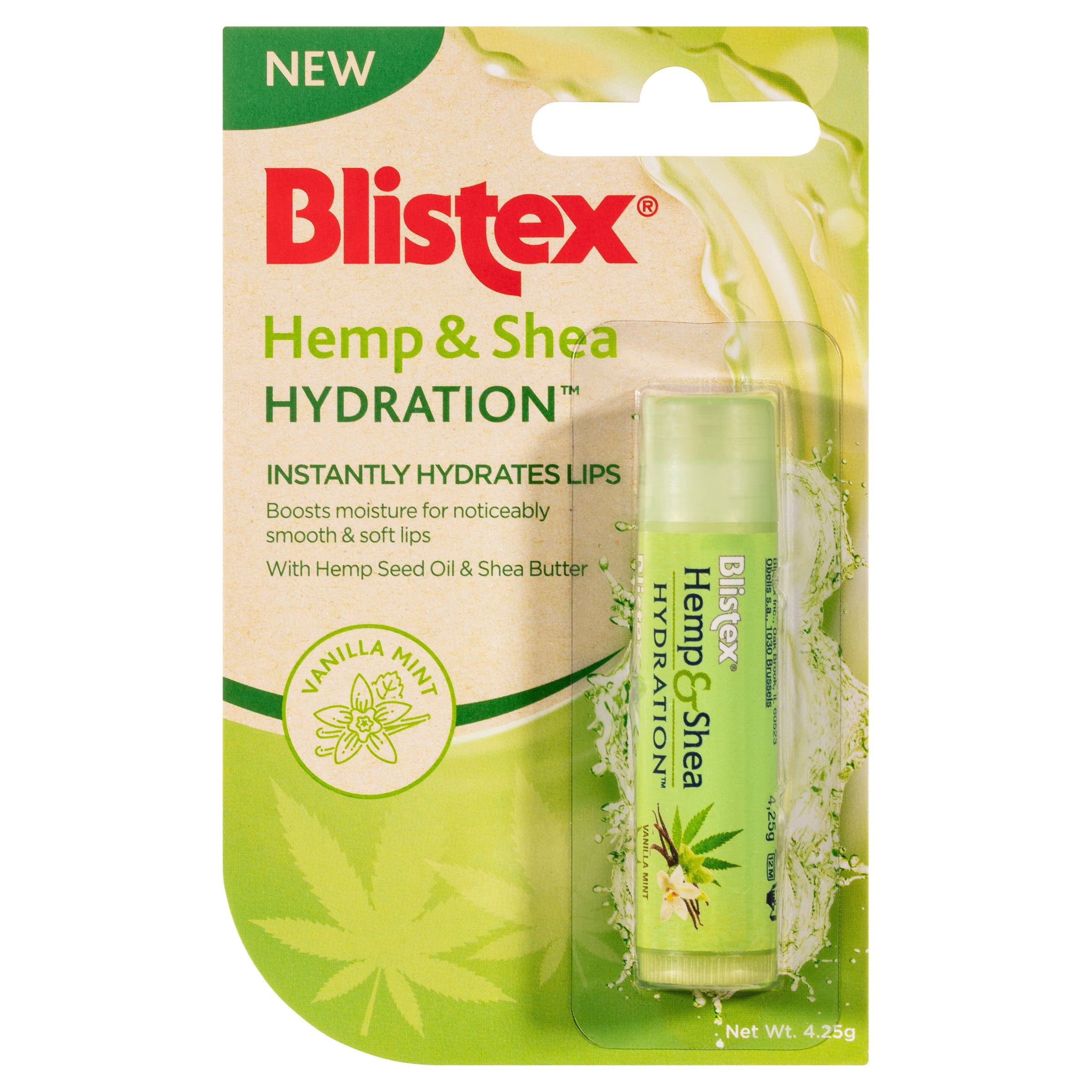 Blistex Hemp & Shea Hydration is an Intensely hydrating lip care formula that lips love, combining Hemp Seed Oil, rich in Omega factty acid, and Shea Butter to moisturise for up to 24 hours. Hemp & Shea Hydration boosts moisture for noticeably smoother & softer lips, and has a delicious Vanilla flavour with a hint of mint.Â