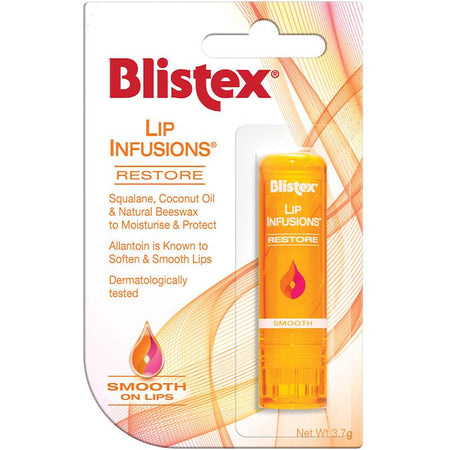 The Blistex Infusions Restore is an advanced lip care formula infused with a blend of Squalane, Coconut Oil, Natural Beeswax and allantoin that restores lips’ moisture and leaves them feeling naturally soft and smooth again.