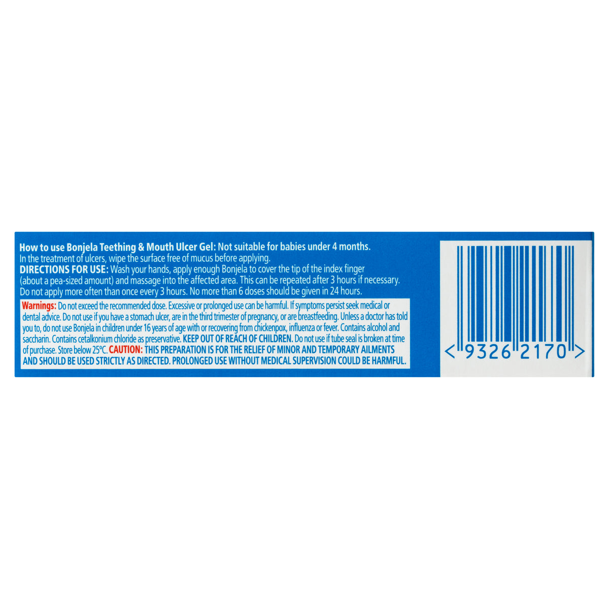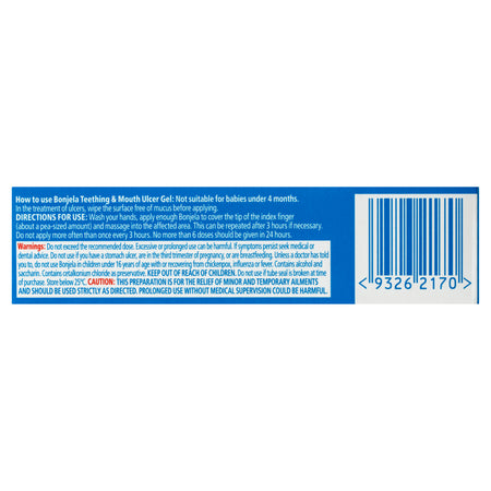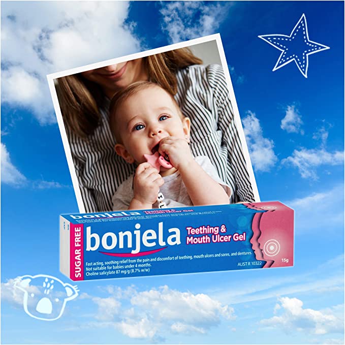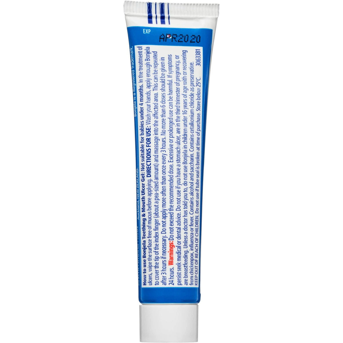 Bonjela is a pleasant-tasting gel that provides fast-acting, soothing relief from the pain and discomfort of teething, mouth ulcers and sores, and dentures. Not suitable for babies under 4 months.