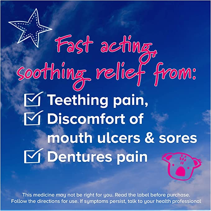 Fast-acting, soothing relief from the pain and discomfort of teething, mouth ulcers and sores, and dentures.