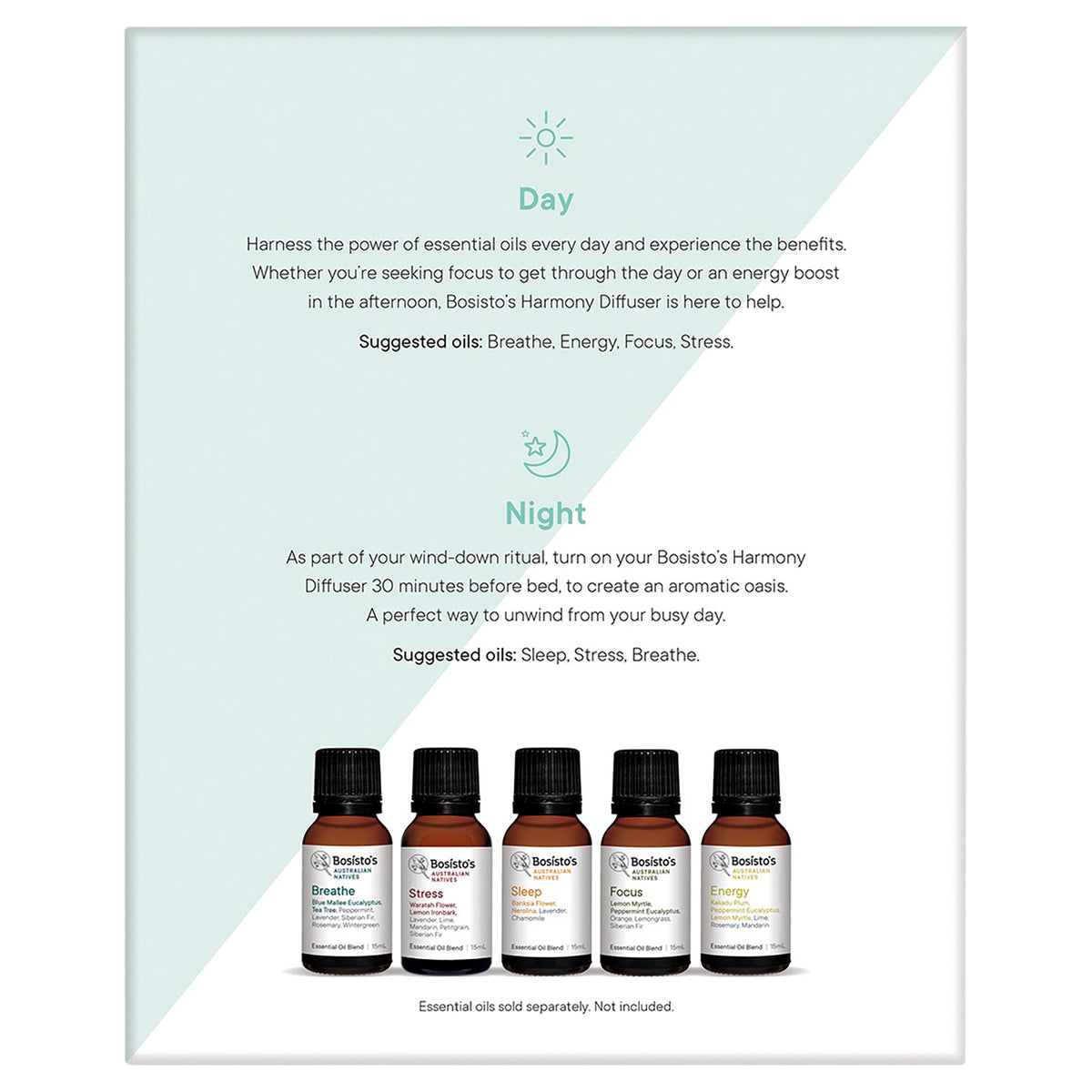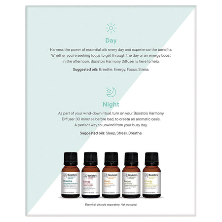 With the Bosistos Harmony Diffuser, you can turn your home into a peaceful sanctuary with the calming, life-enhancing benefits of essential oils. The diffuser humidifies the air and creates an aromatic oasis to help you relax and unwind. Suggested for use with Bosisto's Essential Oils range.