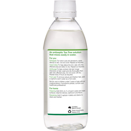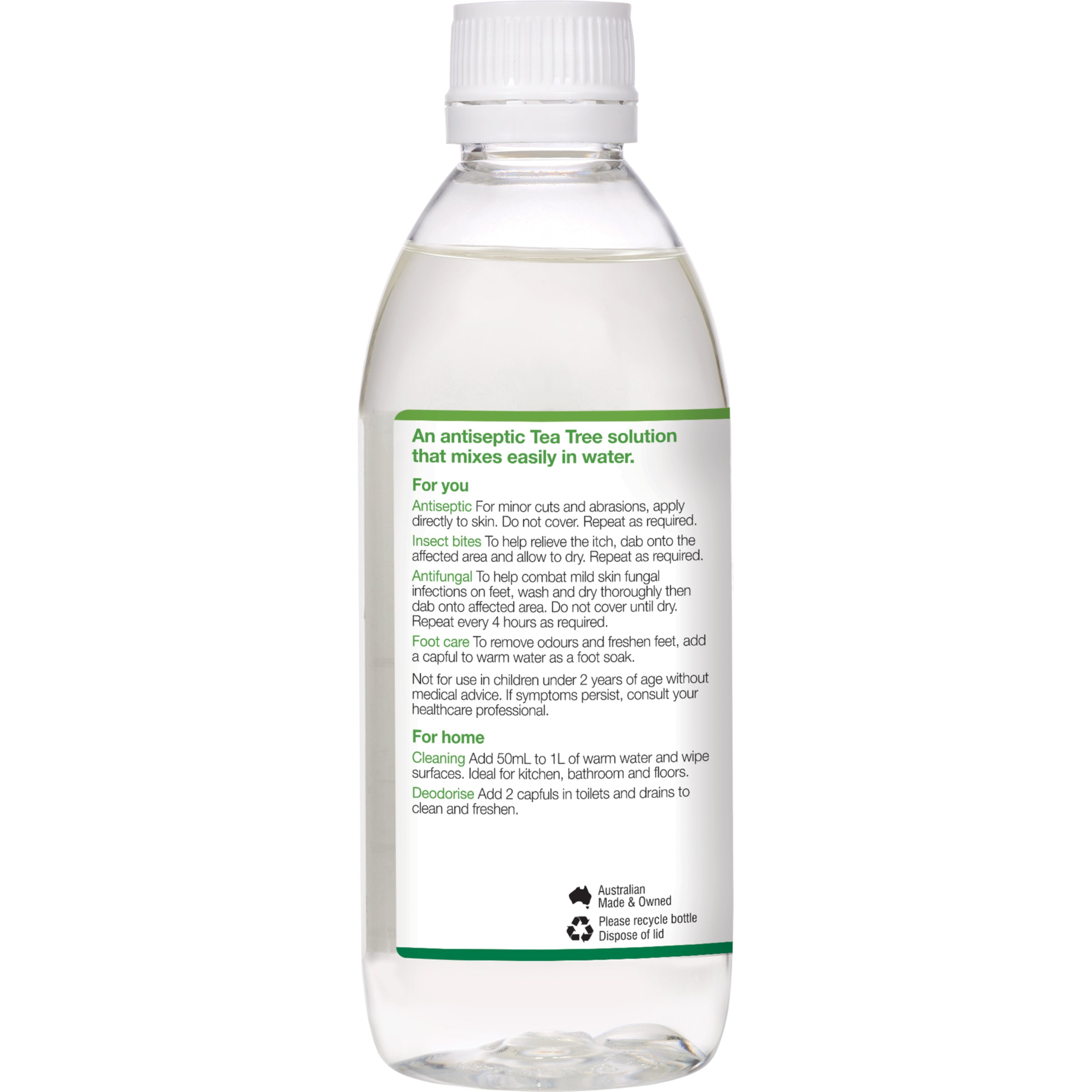 Bosisto's Tea Tree Solution contains Tea Tree Oil in a unique formula which dissolves easily in water. It is antibacterial and antifungal, ideal for foot care, minor wounds and bites. It is also an effective all-purpose household cleaner with a fresh, natural fragrance.