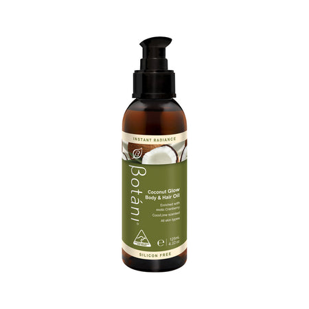 Botani’s unique 2 1 Coconut Glow Hair & Body Oil is a natural alternative to Silicone-based products with a delectable natural scent of Coconut and Lime. A key ingredient is the Crambe abyssinica seed oil, which is native to the Mediterranean. This exquisite active oil is rich in omegas 3 & 6 and amino acids and is able to penetrate deeply into the core of the hair fiber to repair and restore shine and gloss. Featuring the premium moisturising benefits of unrefined certified organic Coconut oil, Cranberry seed oil, and Avocado oil as they soothe and nourish your skin and hair leaving it soft, smooth, and silky. Suitable for all skin types.