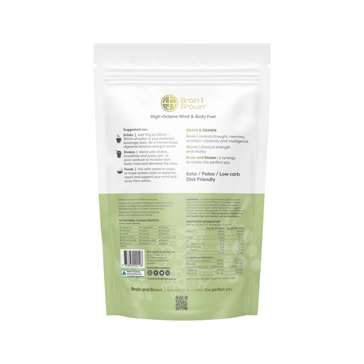 Tri-band vegan proteins (Organic Sprouted Fermented Pea Protein, Fava Bean Protein, Organic Sprouted Rice Protein), with prebiotics, probiotics, adaptogen, nootropic and vitamin B12 the perfect addition to your busy daily schedule, to replenish, repair & support a healthy mind and body.