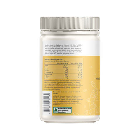 Performance Golden Elixir with organic Turmeric and Collagen helps maintain joint and tendon health with every cup. This 300g blend of organic Turmeric, Collagen, spices, and the right amount of coconut milk is a great source of essential vitamins and minerals for enhancing muscle strength and recovery. It is naturally rich in inflammation-fighting Curcumin and naturally occurring antioxidants to help and promote general well-being.