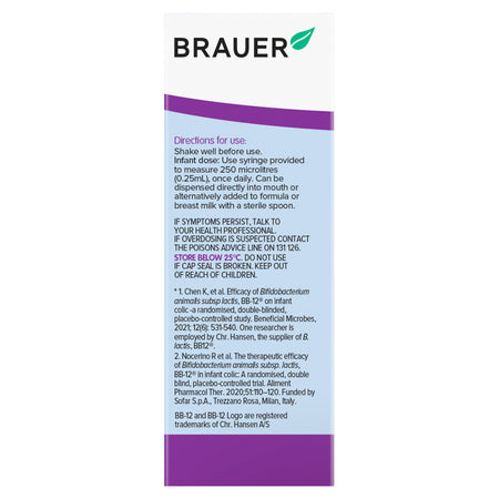 Brauer's ColicEze™ Probiotic Drops contain Bifidobacterium animalis ssp lactis BB-12 and are designed to help relieve symptoms of colic in healthy breastfed infants. Clinical studies on BB-12® probiotic show a reduction in infant colic symptoms by 50% or more after 21 to 28 days.