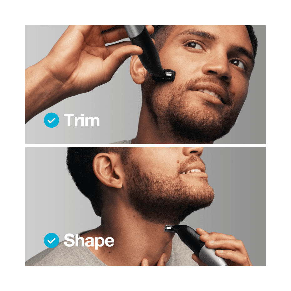 - Designed for precision and control: trim both up and down with the two-way comb. Safely shave and manscape wet or dry thanks to the rubberized, anti-slip handle.