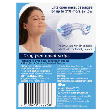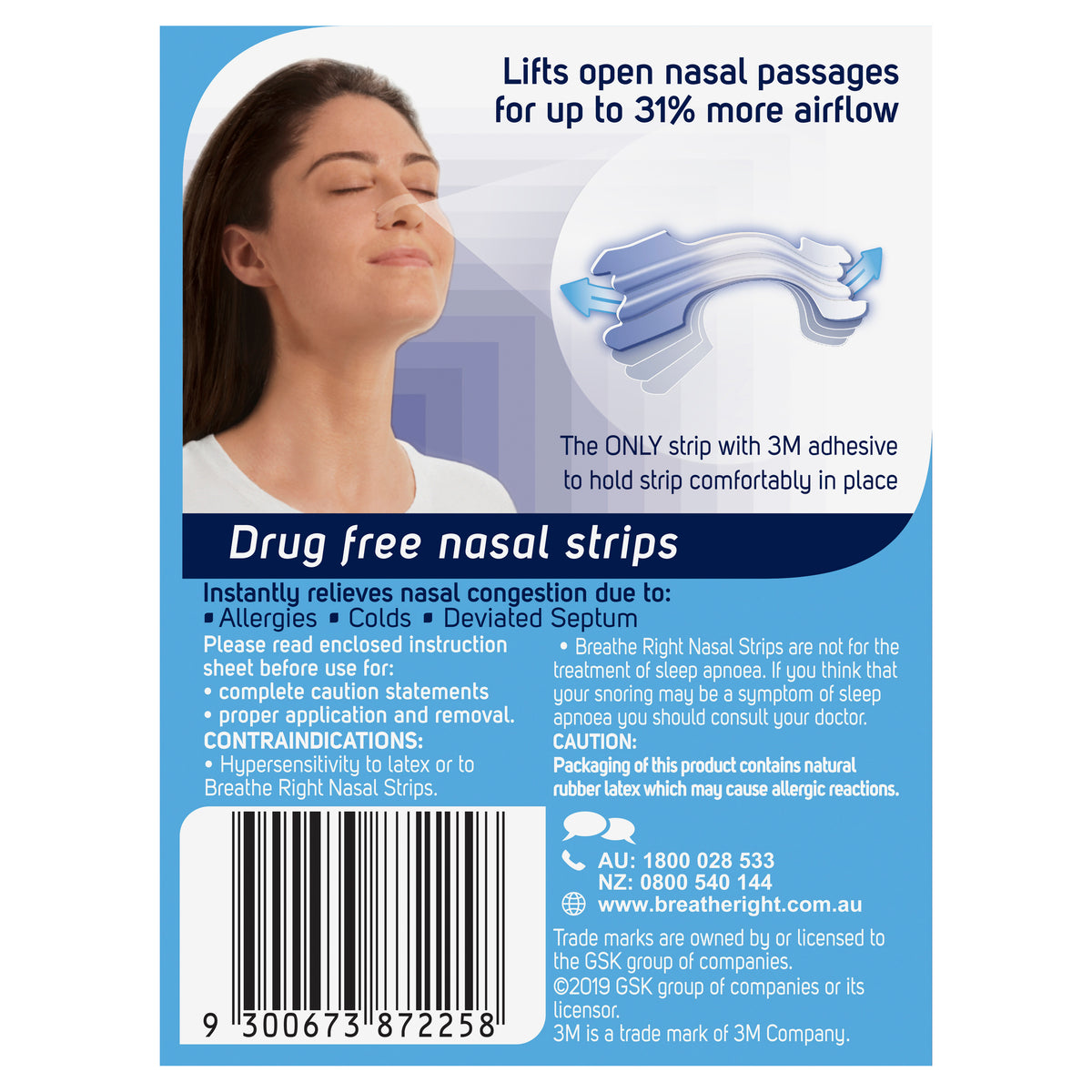 Within each Breathe Right nasal strip are flexible, "spring-like" bands. On the underside is a special adhesive that, when placed properly on the nose, gently sticks to the area right above the flare of each nostril. As the bands attempt to straighten back to their original shape, they gently lift the sides of the nose and open the nasal passages, providing immediate relief. Which helps you breathe better – with no medicine and no waiting.Once applied to the nose, Breathe Right Nasal Congestion Strips work by gently opening nasal passages allowing you to breathe through your nose instead of your mouth. Thereby relieving congestion, reducing snoring and helping you breathe more easily while you sleep.