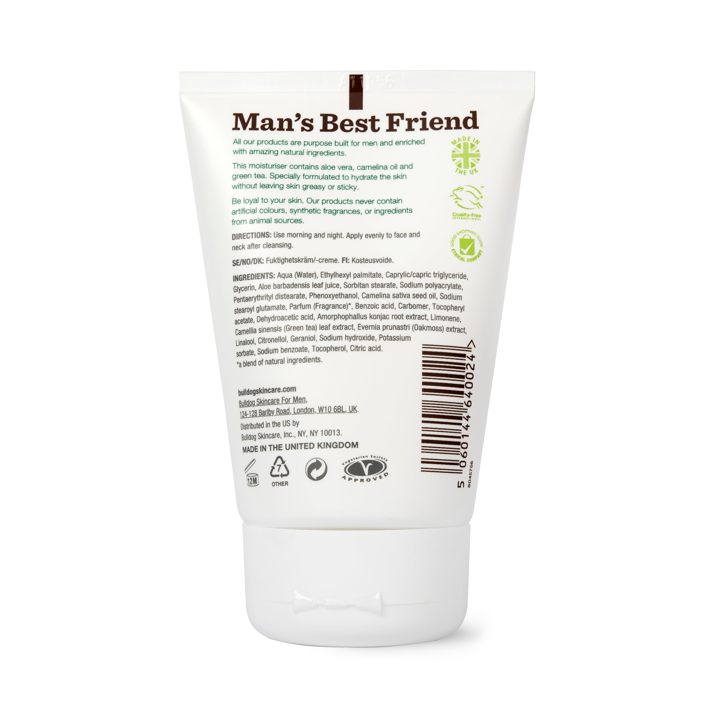 Man's Best Friend.All our products are purpose-built for men and enriched with amazing natural ingredients. This moisturiser contains aloe vera, camelina oil and green tea. Specially formulated to hydrate the skin without leaving the skin greasy or sticky.