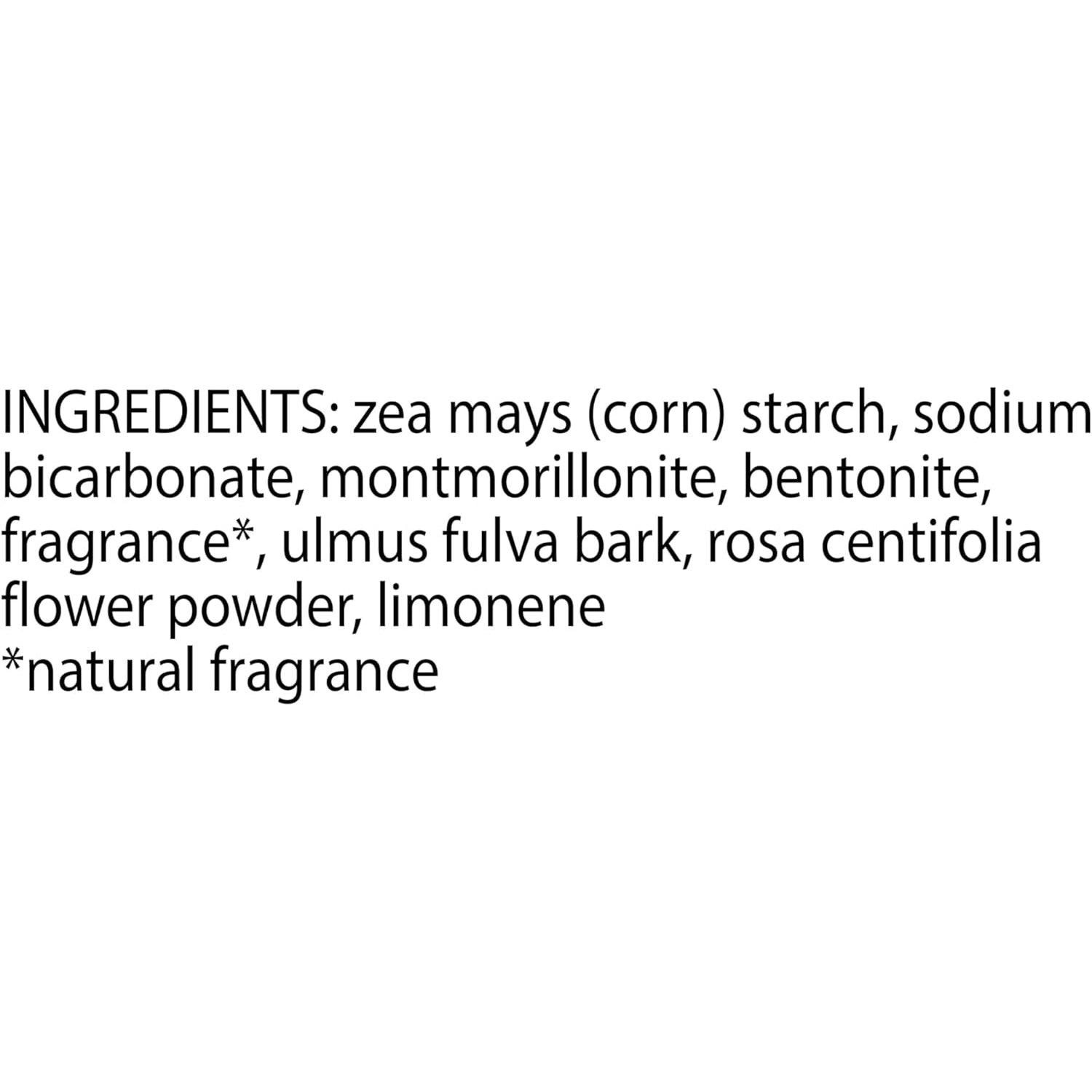 Zea mays (corn) starch, sodium bicarbonate, montmorillonite, bentonite, Commiphora myrrha (Myrrh) leaf cell extract, Ulmus fulva (Slippery elm) bark powder, Rosa centifolia (Cabbage rose) flower extract, parfum (natural fragrance), limonene.