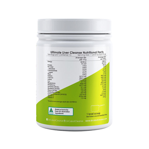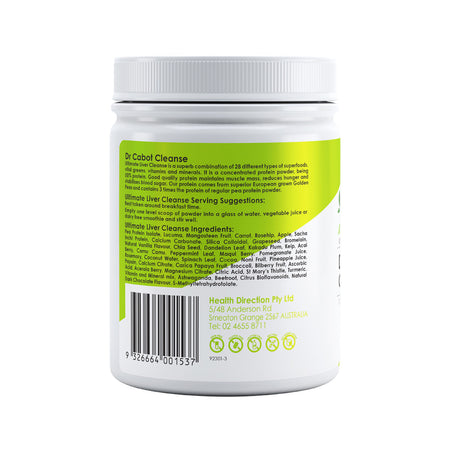 The Ultimate Liver Cleanse powder is a comprehensive formulation, combining potent antioxidants, high quality superfoods, herbs, greens, vitamins and minerals. It is very high in protein, containing 60% protein by weight. The protein comes from superior Golden Pea protein and is suitable for vegans. This powder contains over 40 key ingredients to support liver and immune health and to increase energy.