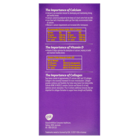 Caltrate Bone & Muscle combines a unique blend of calcium and 4 other minerals that are important for collagen formation to support bone strength & flexibility. Plus high levels of Vitamin D to support muscle strength, to help keep you moving.Suitable For: Adults.