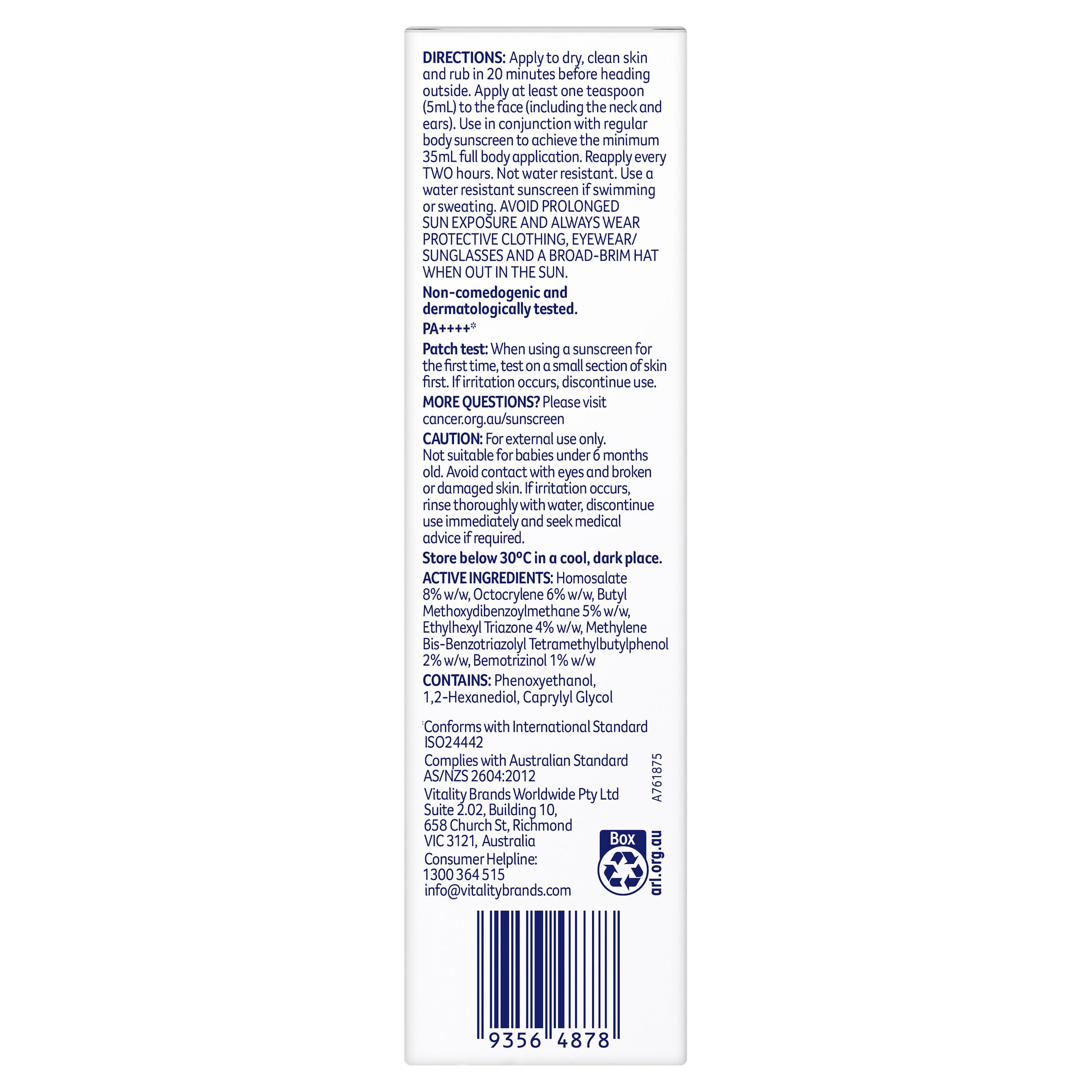 Apply to dry, clean skin and rub in 20 minutes before heading outside. Apply at least one teaspoon (5mL) to the face (including the neck and ears). Use in conjunction with regular body sunscreen to achieve the minimum 35mL full body application. Reapply every TWO hours. Not water-resistant. Use a water-resistant sunscreen if swimming or sweating. AVOID PROLONGED SUN EXPOSURE AND ALWAYS WEAR PROTECTIVE CLOTHING, EYEWEAR/SUNGLASSES AND A BROAD-BRIM HAT WHEN OUT IN THE SUN.