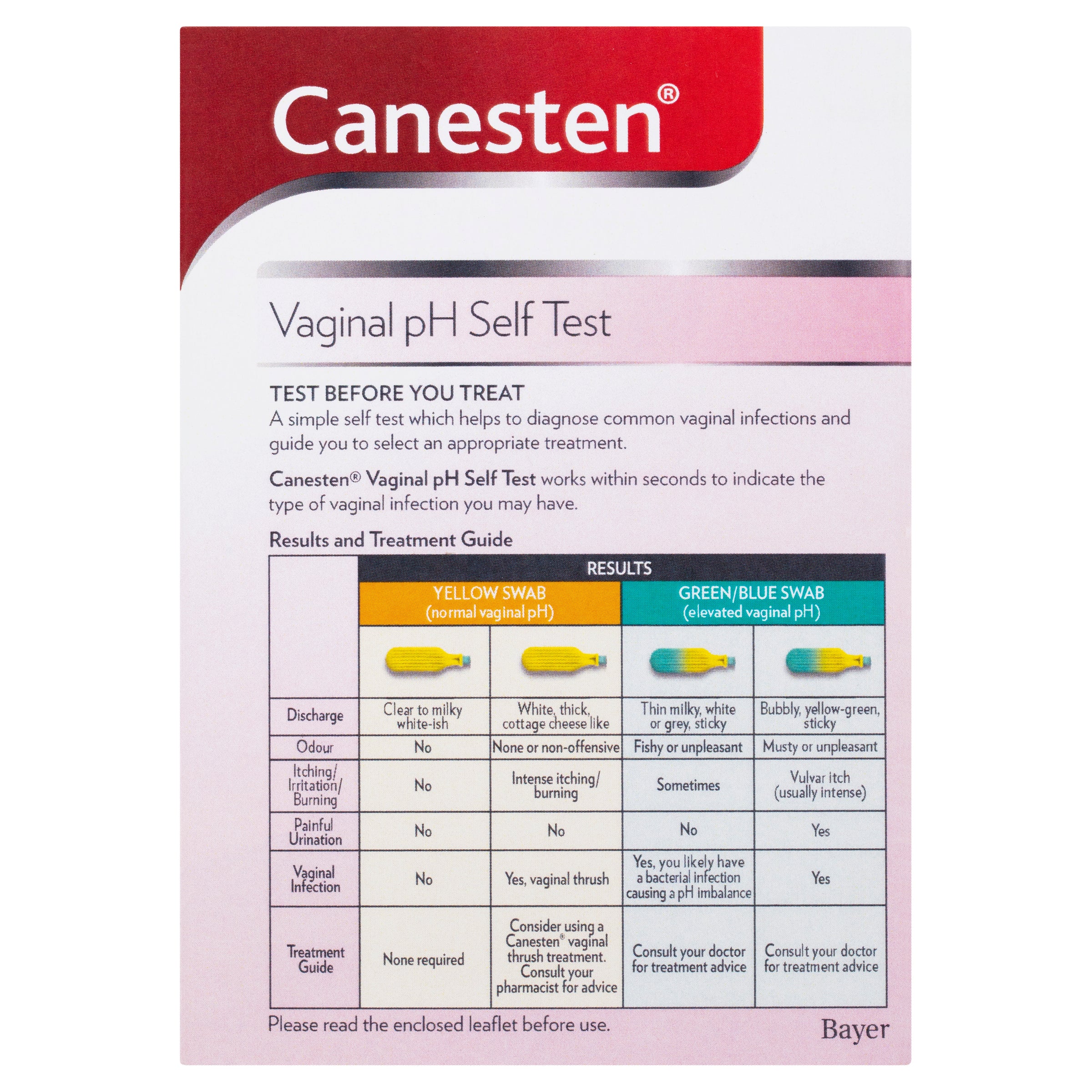 The Canesten Vaginal pH Self Test identifies the level of vaginal pH acidity (normal or elevated) by testing vaginal secretions. The resulting colour indicates the pH level. The test result should be interpreted in conjunction with your symptoms, based on the treatment guide on the back of the pack.