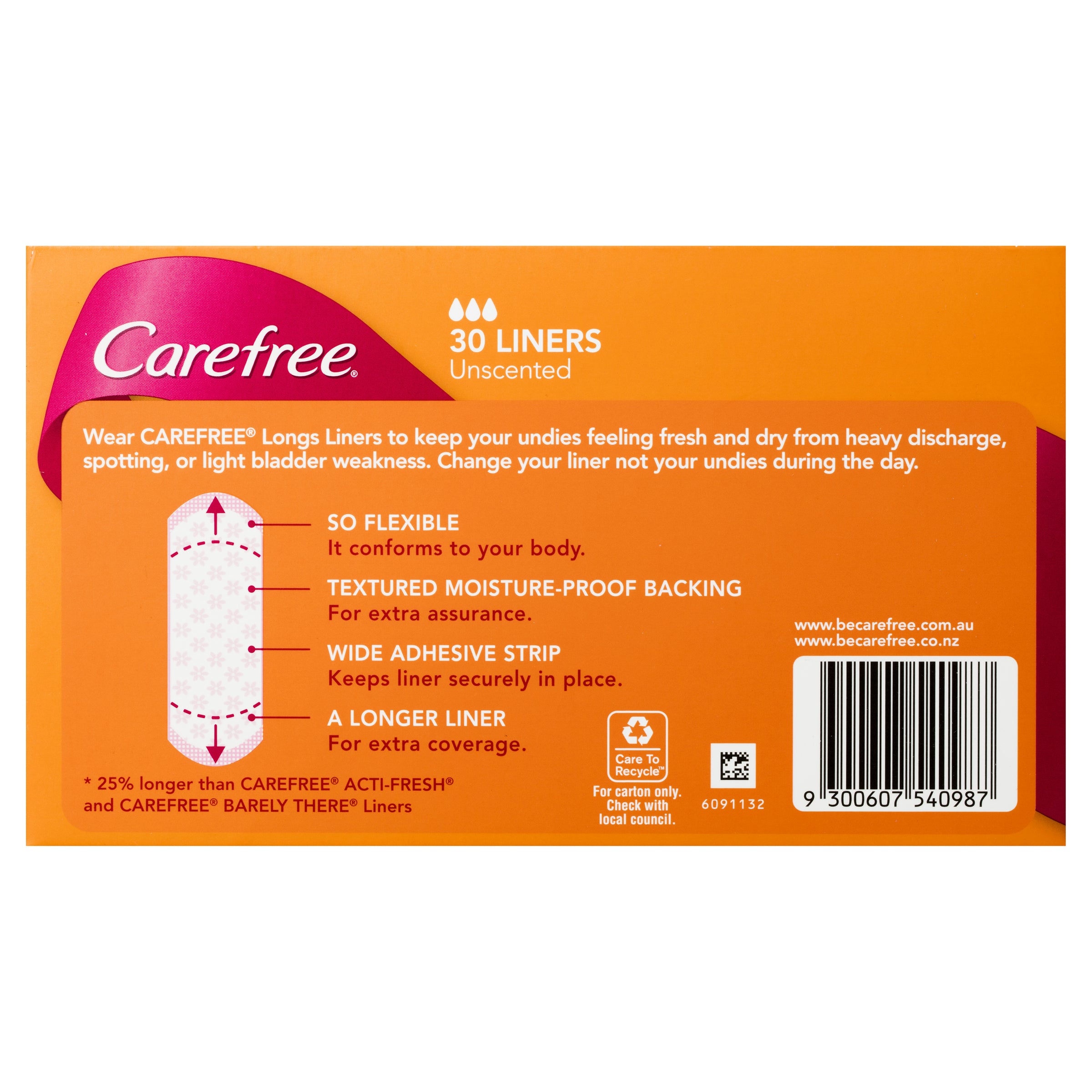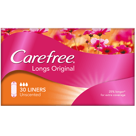 Carefree Longs Original Liners are 25% longer for extra coverage. Wear Carefree Longs Liners to keep your undies feeling fresh and dry from heavy discharge, spotting, or light bladder weakness. Change your liner not your undies during the day. - So flexible it conforms to your body. - Textured moisture-proof backing for extra assurance. - Wide adhesive strip keeps liner securely in place. - A longer liner for extra coverage. - 25% longer extra coverage (25% longer than Carefree Acti-Fresh and Carefree Barely There Liners). |