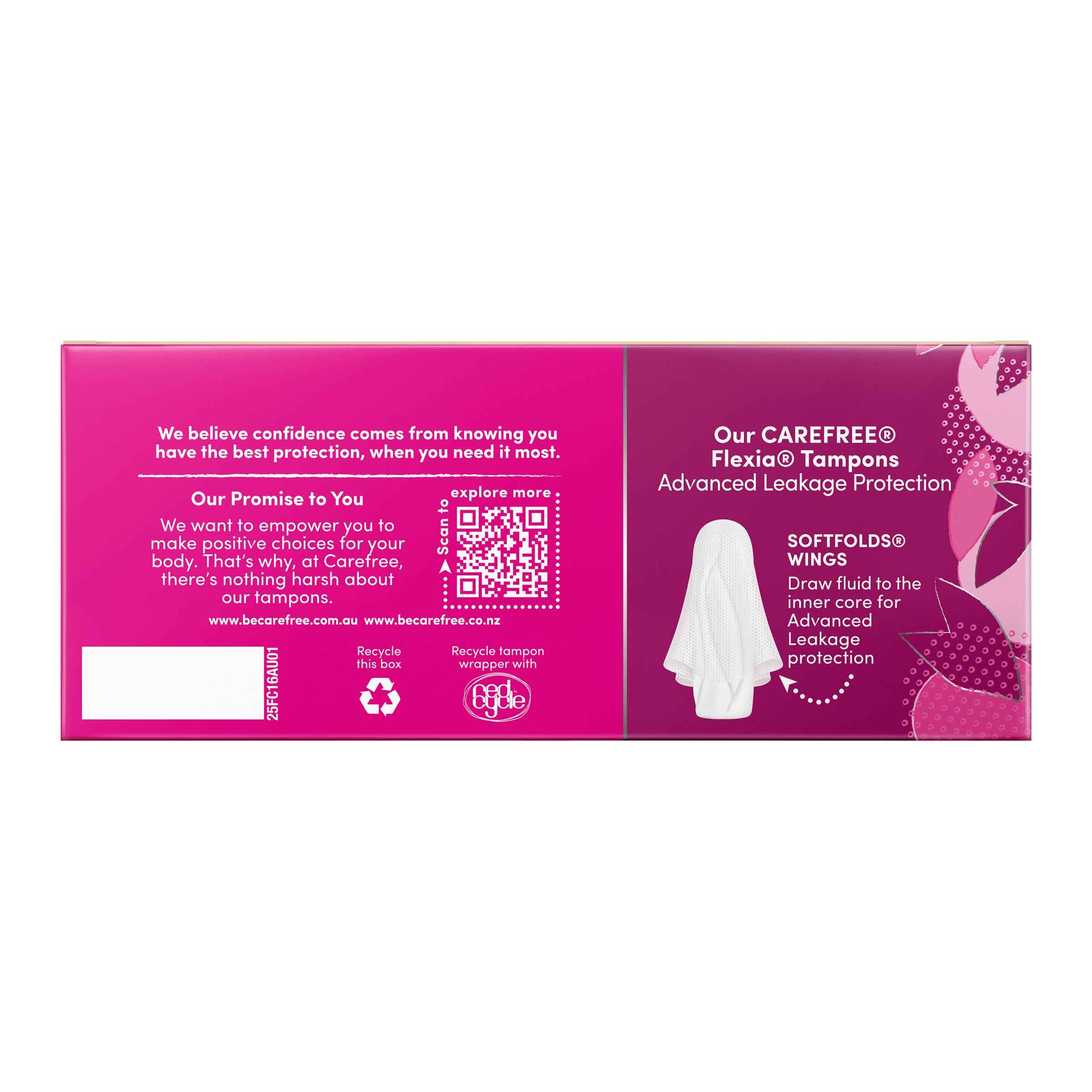 Carefree Flexia Tampons Super with Softfolds catch fluid other tampons may miss. Carefree Flexia tampons with unique Softfolds flexible wings for our most advanced protection against leakage. Adapts To Your Body: Softfolds adapt to your body to catch fluid other tampons may miss. Advanced Protection: Softfolds draw fluid to the inner core of the tampon for extra peace of mind. CPP |