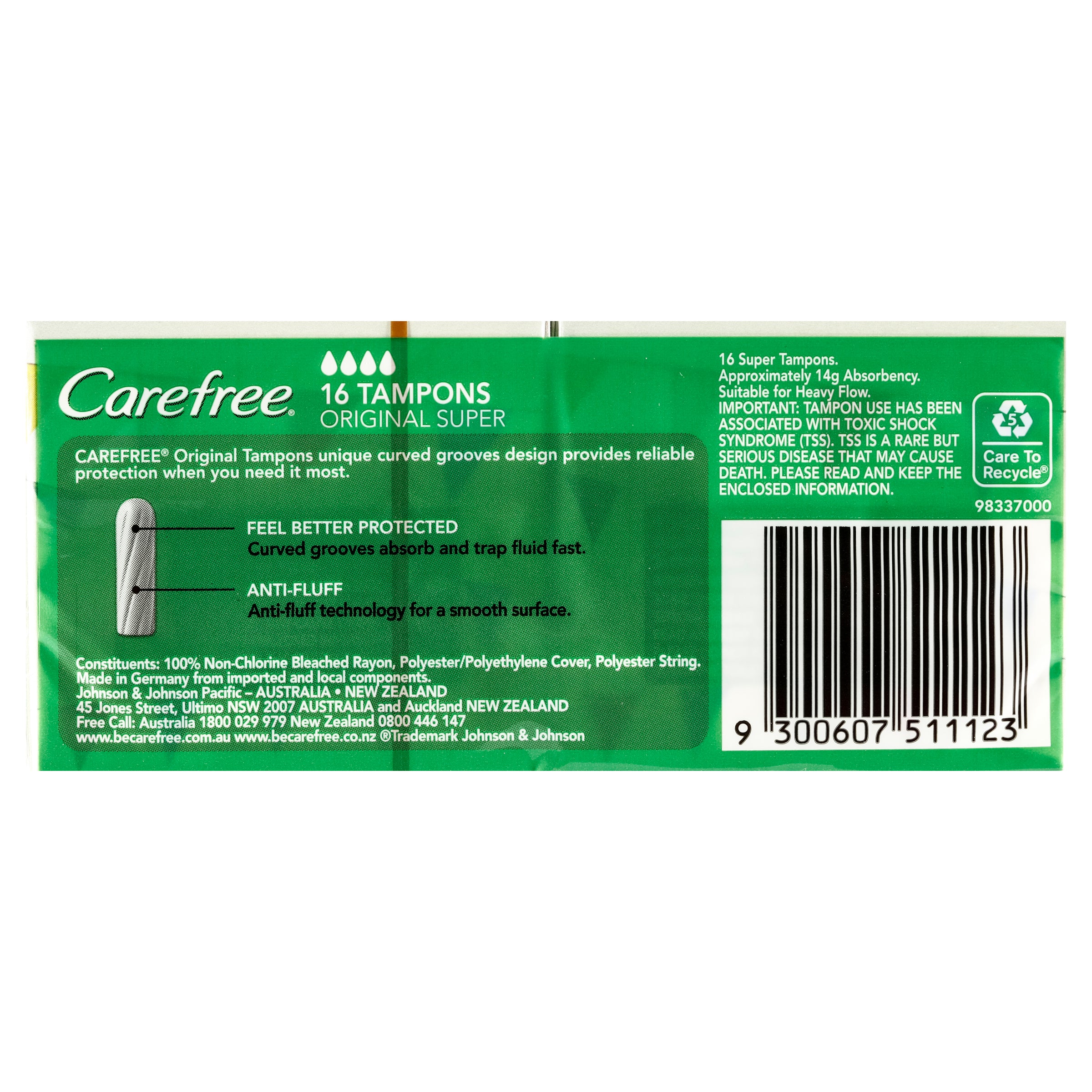 Carefree tampons with curved grooves are specially designed so you feel better protected. Carefree Original Tampons unique curved grooves design provides reliable protection when you need it most. Feel better protected: Curved grooves absorb and trap fluid fast. Anti-Fluff: Anti-fluff technology for a smooth surface. CPP |