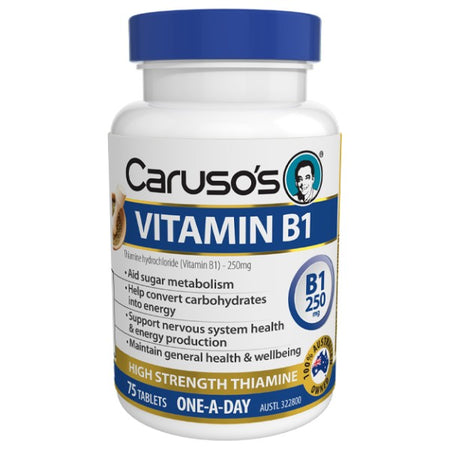 Caruso’s Vitamin B1 (thiamine) is a high strength, one-a-day tablet for those who require additional Vitamin B1 to assist with the synthesis of neurotransmitters and to help support nervous system function. Caruso’s Vitamin B1 may also help to maintain energy production through carbohydrate and protein metabolism.