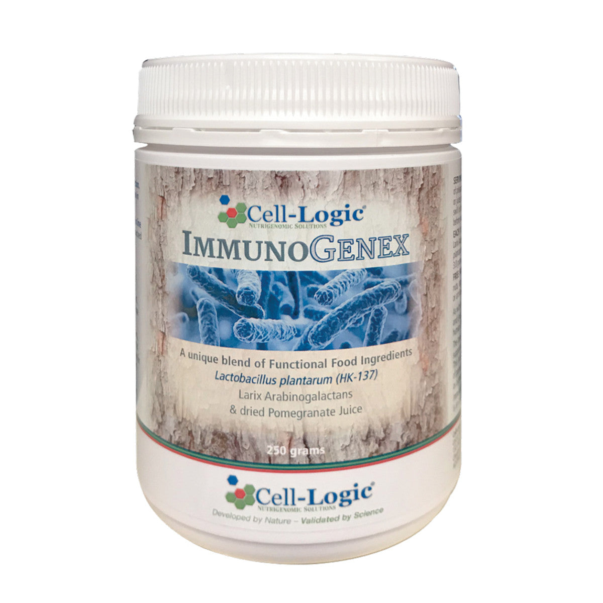 ImmunGenex is a unique blend of functional food ingredients containing Lactobacillus plantarum (HK-137), Larix Arabinogalactans and dried Pomegranate Juice. ImmunoGenex is an immunobiotic solution to gut-related and systemic Immune Dysfunction, optimising the Gut Ecology.