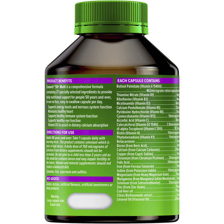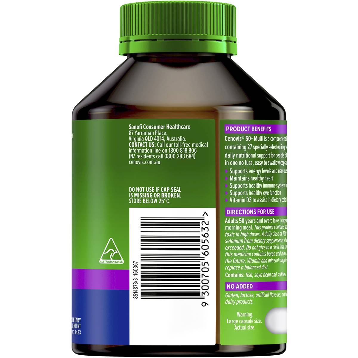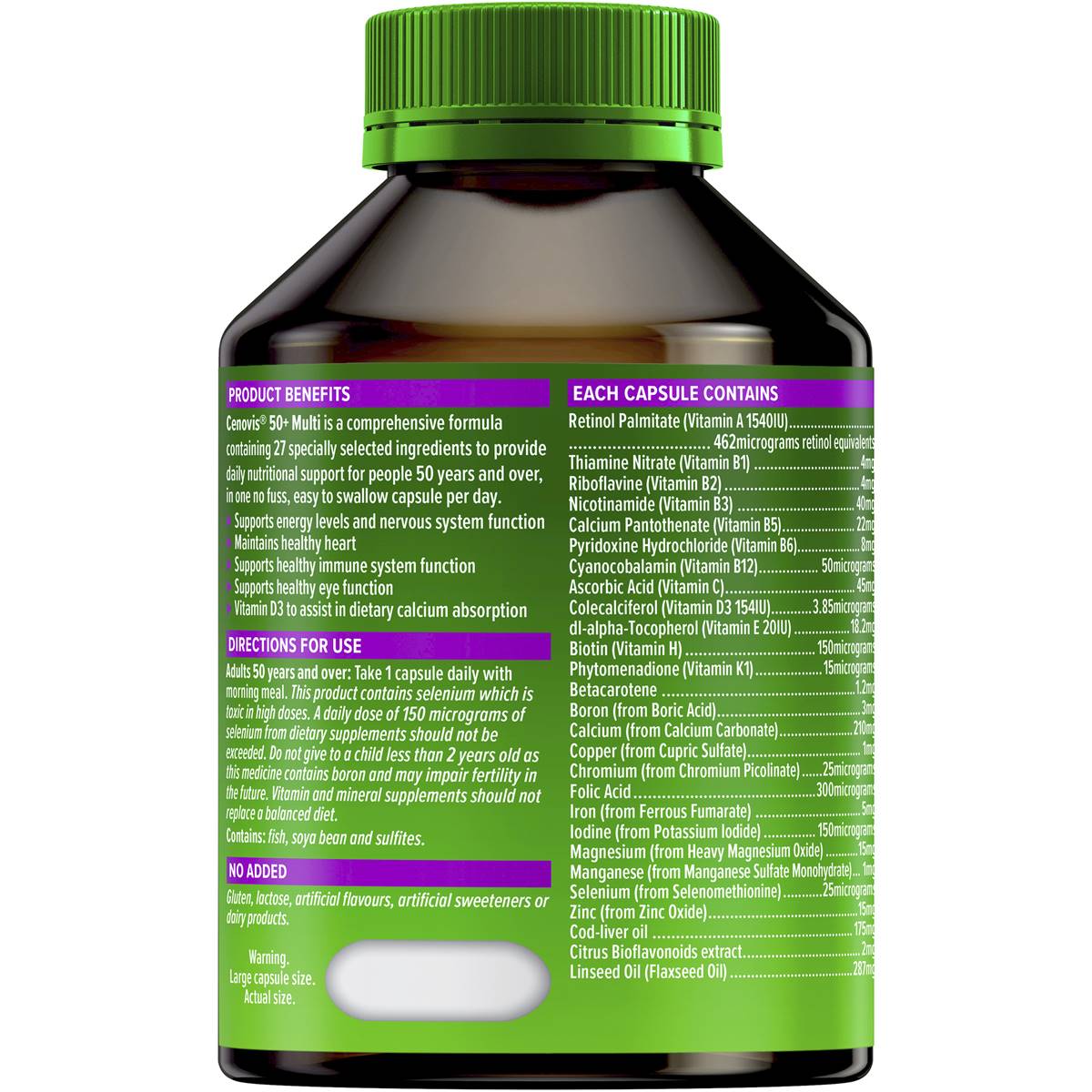 Cenovis® 50+ Multi is a comprehensive formula containing 27 specially selected ingredients to provide daily nutritional support for people 50 years and over, in one no fuss, easy to swallow capsule per day.• Supports energy levels and nervous system function.
