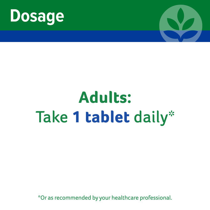 Recommended adult dosage: Adults take one tablet daily swallowed whole or as directed by your healthcare professional.
