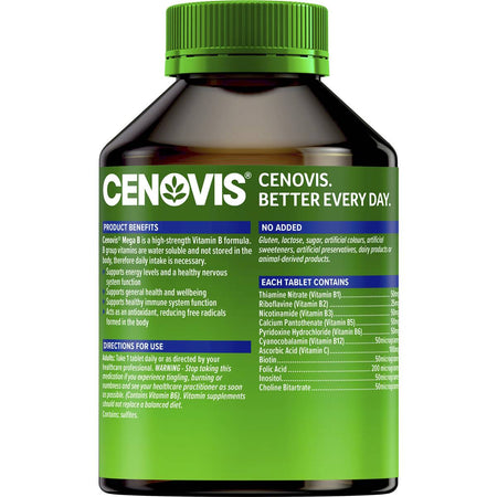 Cenovis® Mega B tablets assist in the improvement of general well-being and provide support to the nervous system which may be beneficial during times of stress. Cenovis® Mega B tablets help maintain healthy brain function. Vitamin B3 facilitates energy production and is essential for healthy skin, blood cells and digestive system. B group vitamins are water soluble, so are not stored in the body and daily intake is necessary.
