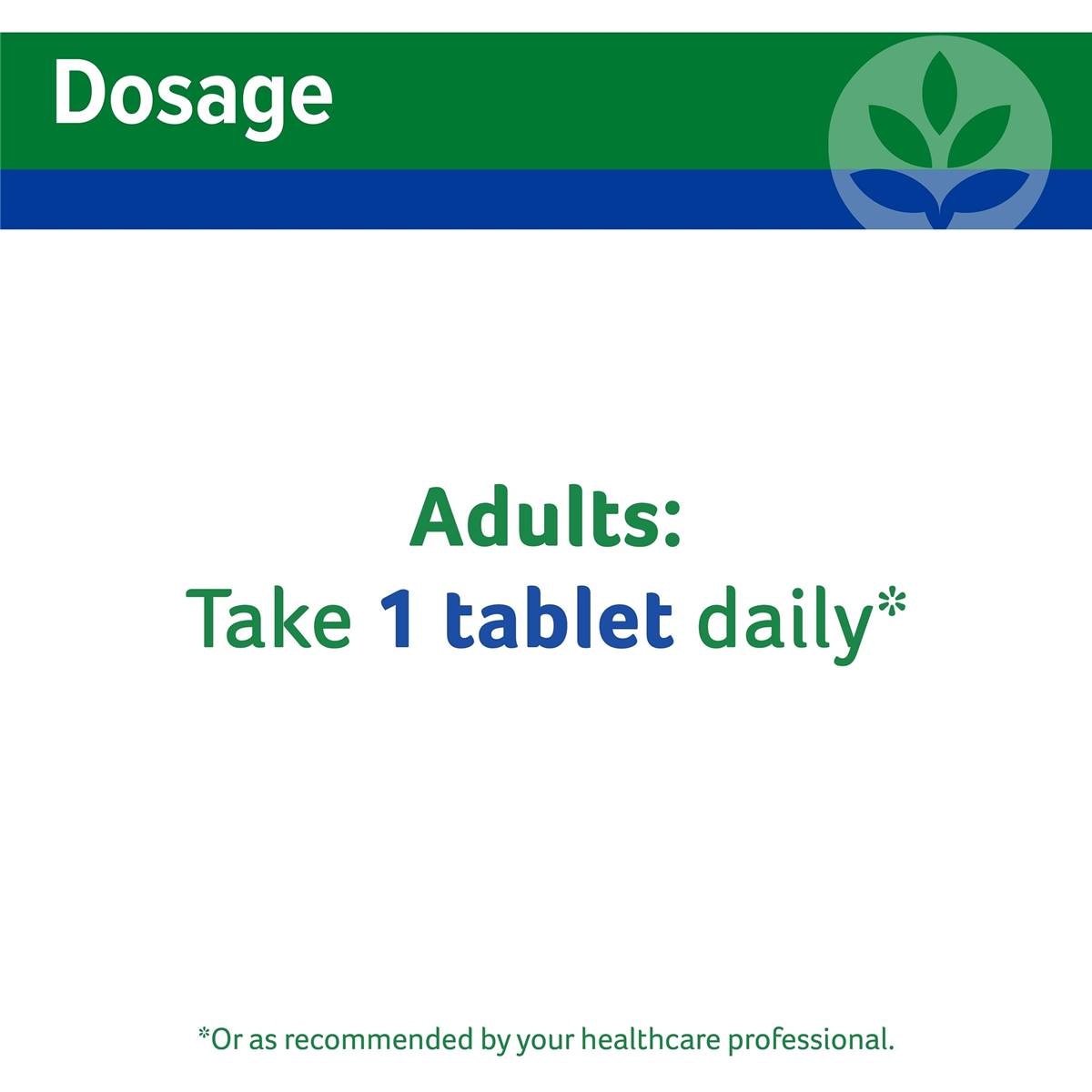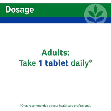Recommended adult dosage: Adults take one tablet daily swallowed whole or as directed by your healthcare professional.