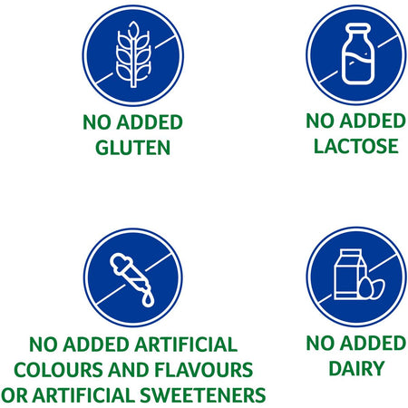Contains: NO ADDED: Gluten, lactose, artificial colours, artificial flavours, artificial sweeteners or dairy products.