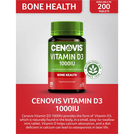 Cenovis® Vitamin D3 1000IU provides the form of Vitamin D3, which is naturally found in the body, in a small easy-to-swallow mini tablet. Vitamin D helps calcium absorption and a diet deficient in calcium can lead to osteoporosis in later life.