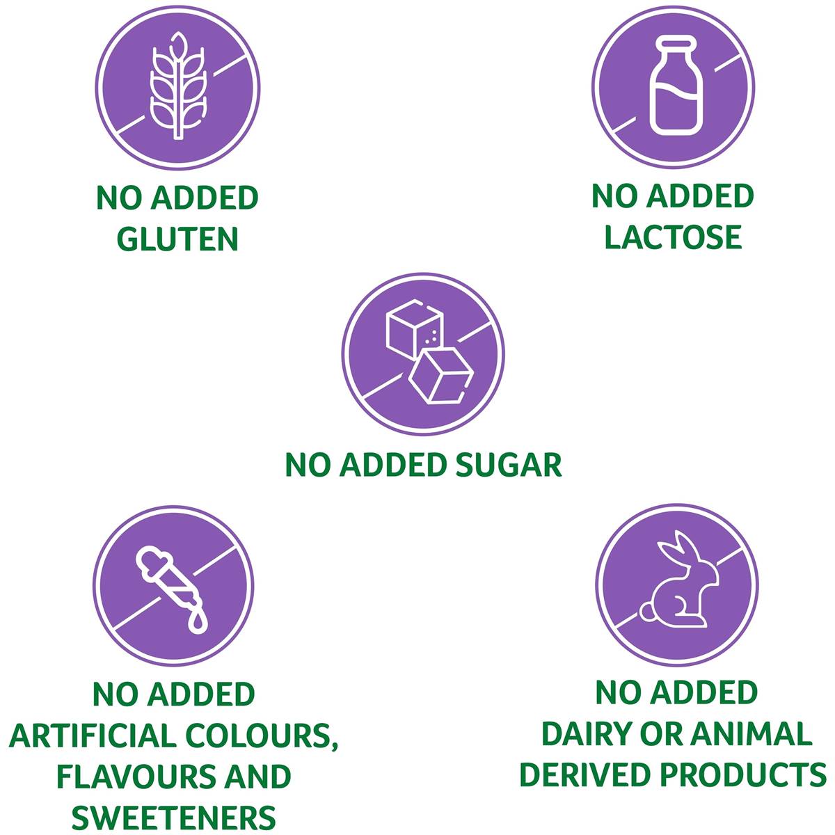 No added gluten, lactose, sugar, artificial flavours, artificial sweeteners, artificial preservatives, dairy products, animal-derived products.Ingredients