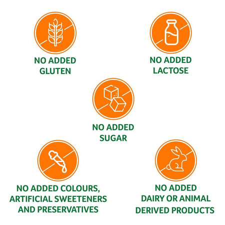Contains no added yeast, gluten, sugar, lactose, artificial colors or flavours, artificial sweetners or preservatives, dairy products or animal-derived products