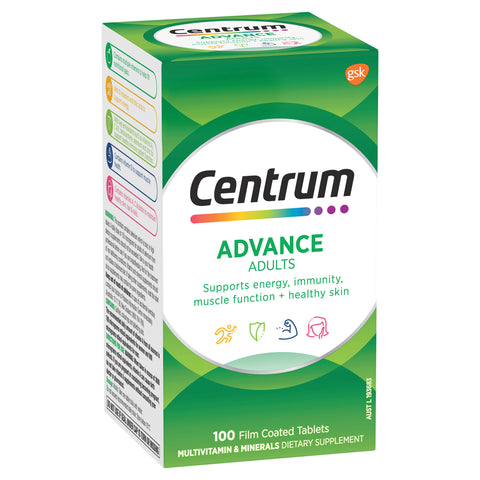 Centrum Advance For Adults multivitamin and minerals are complete from A to Zinc and support healthy skin, muscle function, energy and immunity.