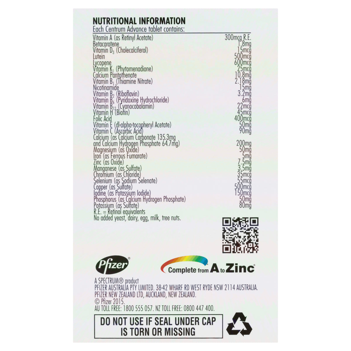 Centrum Advance contains many of the essential vitamins and minerals to help support multiple health benefits. B group vitamins help support daily energy needs, key antioxidants help support a healthy immune function and vitamins A, C and Biotin help support healthy skin.