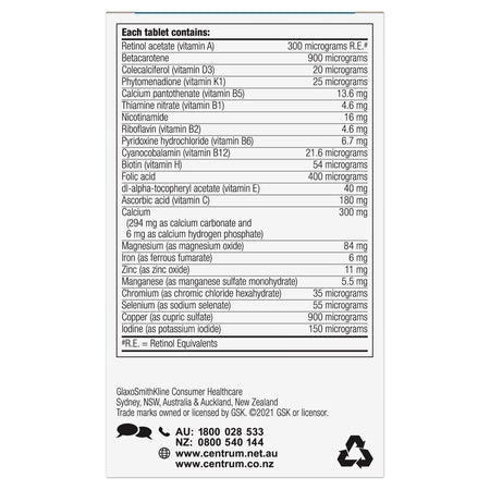 Retinol Acetate (Vitamin A) 300 micrograms R.E. (Retinol Equivalents), Betacarotene 900 micrograms, Colecalciferol (Vitamin D3) 20 micrograms, Phytomenadione (Vitamin K1) 25 micrograms, Calcium Pantothenate 13.6mg equiv. Pantothenic acid 12.5mg, Thiamine Nitrate (Vitamin B1) 4.6mg, Nicotinamide 16mg, Riboflavin (Vitamin B2) 4.6mg, Pyridoxine Hydrochloride (B6) 6.7mg, Cyanocobalamin (Vitamin B12) 21.6 micrograms, Biotin (Vitamin H) 54 micrograms, Folic Acid 400 micrograms, dl-alpha-Tocopheryl Acetate (Vitamin E) 40mg, Ascorbic Acid (Vitamin C) 180mg, Calcium (294mg as Calcium Carbonate and 6mg as Calcium Hydrogen Phosphate) 300mg, Magnesium (as Magnesium Oxide) 84mg, Iron (as Ferrous Fumarate) 6mg, Zinc (as Zinc Oxide) 11mg, Manganese (as Manganese Sulfate Monohydrate) 5.5mg, Chromium (as Chromic Chloride Hexahydrate) 35 micrograms, Selenium (as Sodium Selenate) 55 micrograms, Copper (as Cupric Sulfate) 900 micrograms, Iodine (as Potassium Iodide) 150 micrograms.