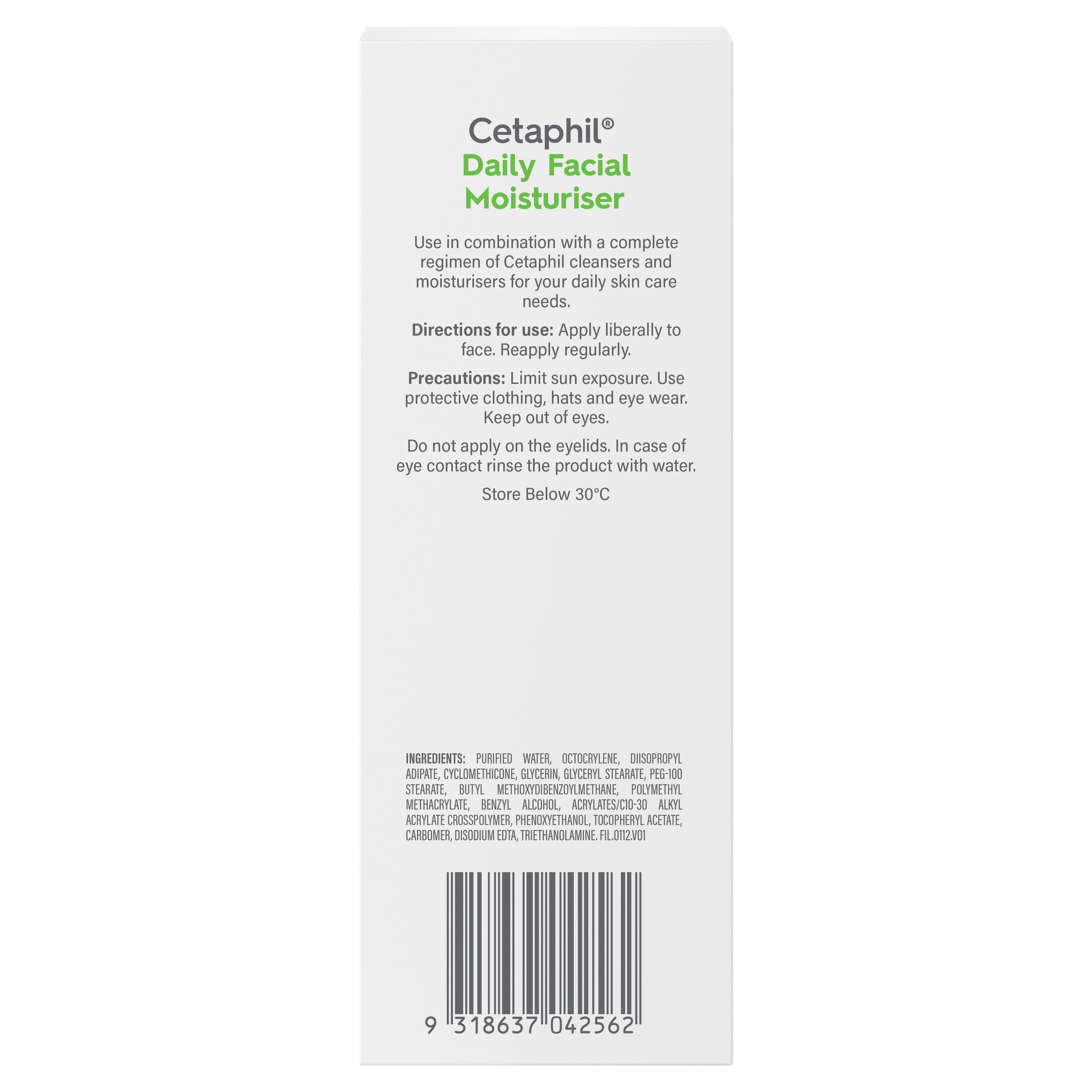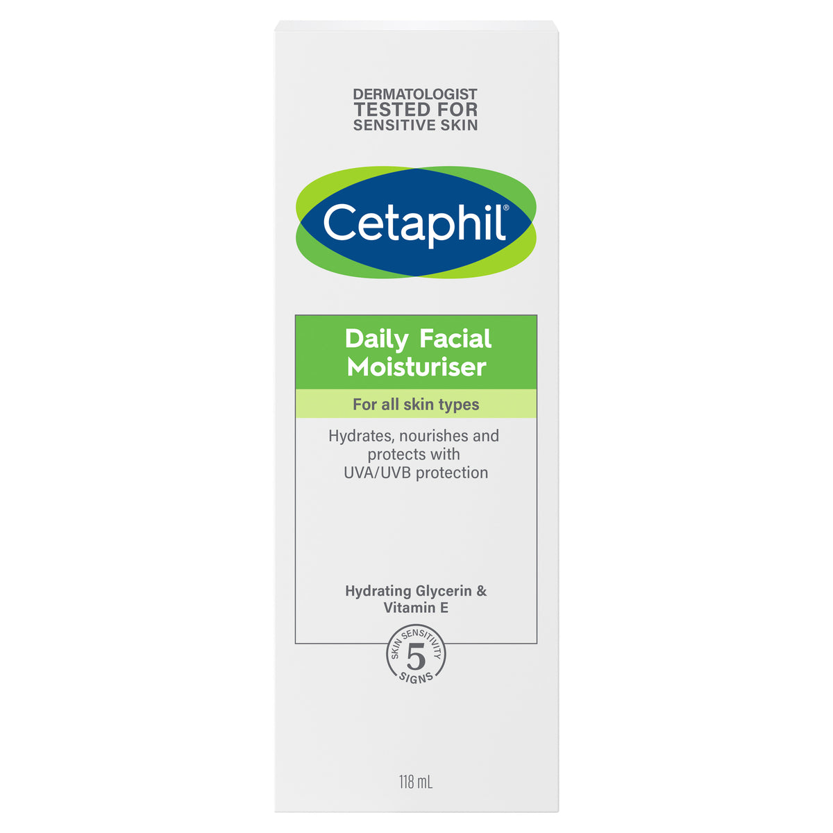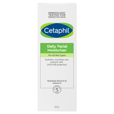 Cetaphil Daily Facial Moisturiser is a daily care for sensitive skin for your face that won't block pores, fragrance free, non-greasy with UVA/UVB filters.