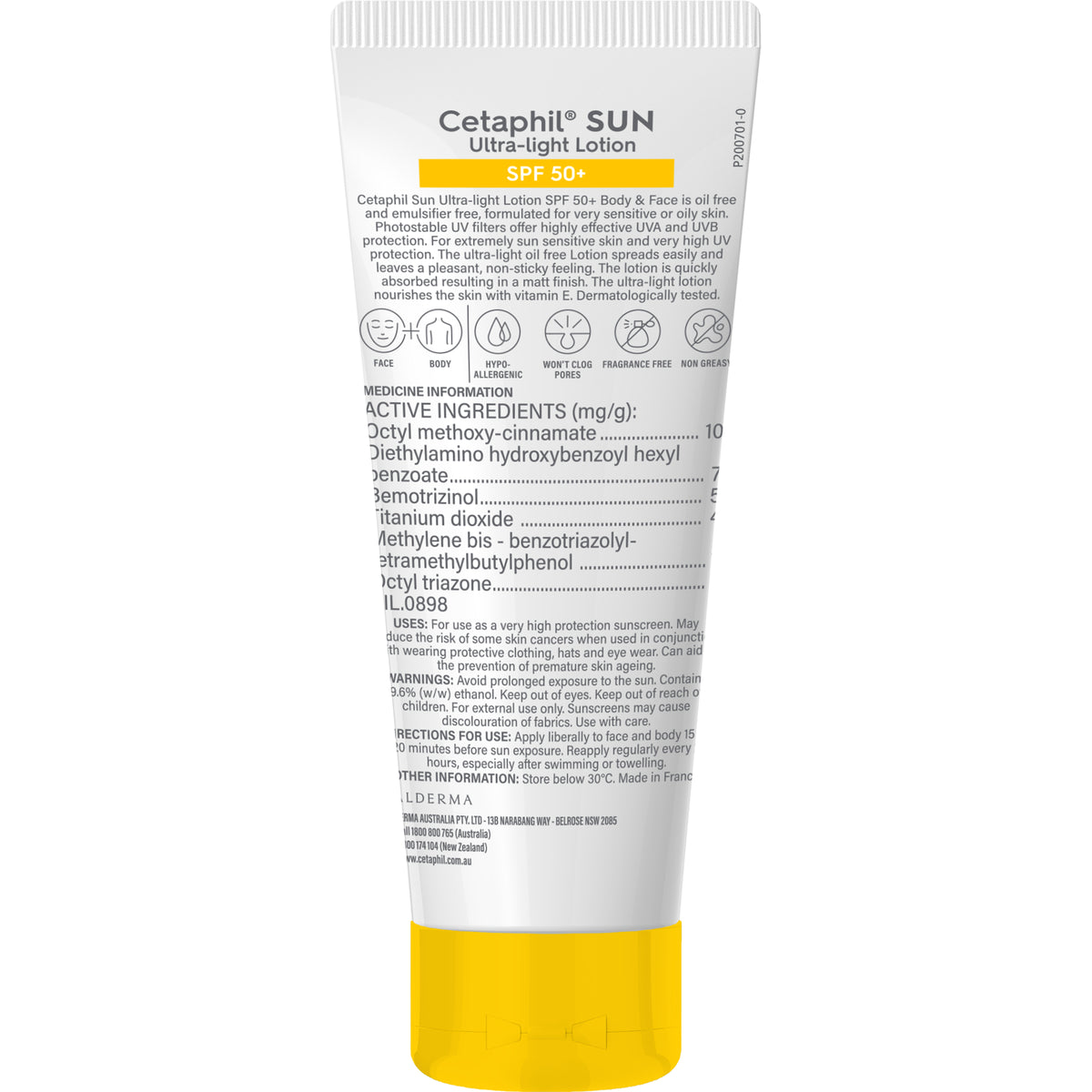 Cetaphil Sun Ultra-Light Lotion SPF50+, body and faceis oil free and emulsifier free, formulated for very sensitive or oily skin.