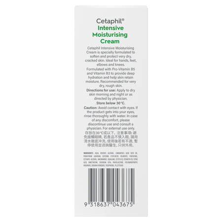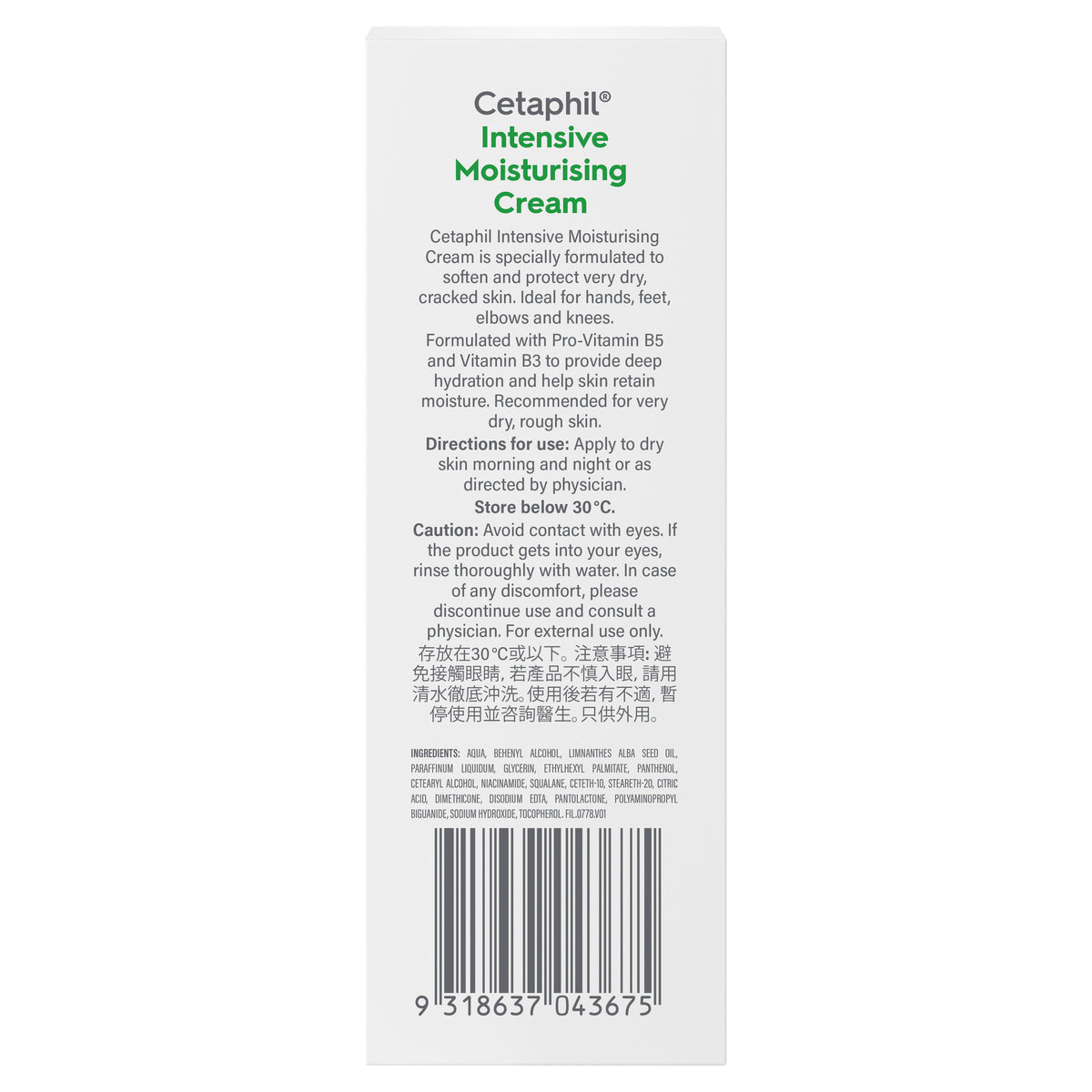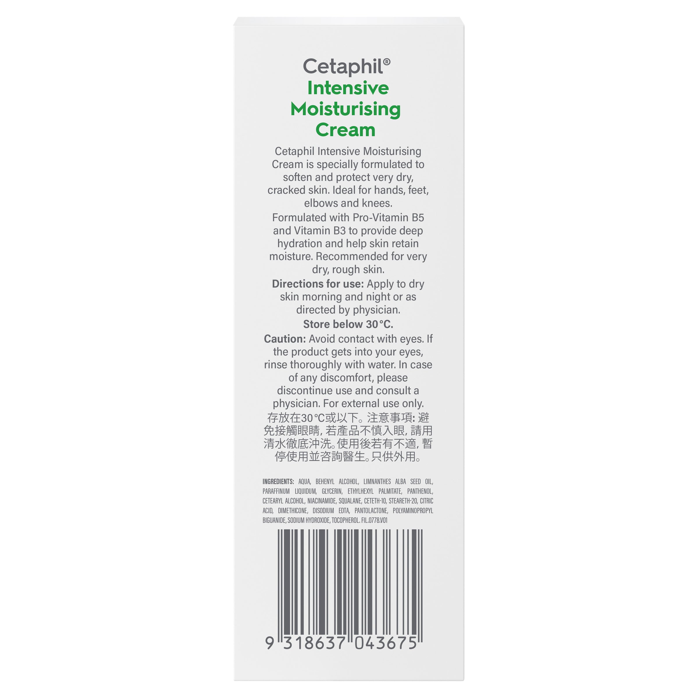 Cetaphil Intensive Moisturising Cream is specially formulated to soften and protect very dry, cracked skin. Idal for hands, feet, elbows and knees. Formulated with Pro-Vitamin B5 and Vitamin B3 to provide deep hydration and help skin retain moisture.
