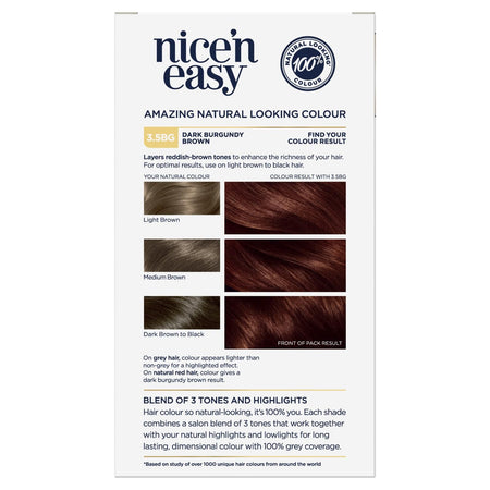 Nice 'N Easy colour blend technology gives you ultimate natural-looking colour by layering rich tones and contouring highlights in one simple step.Nice 'N Easy lasts up to 8 weeks and promises 100% grey coverage. We have also included our exclusive ColourSeal Conditioning Gloss to help seal in beautiful, natural-looking colour and add intense shine.