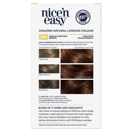 Nice 'N Easy colour blend technology gives you ultimate natural-looking colour by layering rich tones and contouring highlights in one simple step.Nice 'N Easy lasts up to 8 weeks and promises 100% grey coverage. We have also included our exclusive ColourSeal Conditioning Gloss to help seal in beautiful, natural-looking colour and add intense shine.