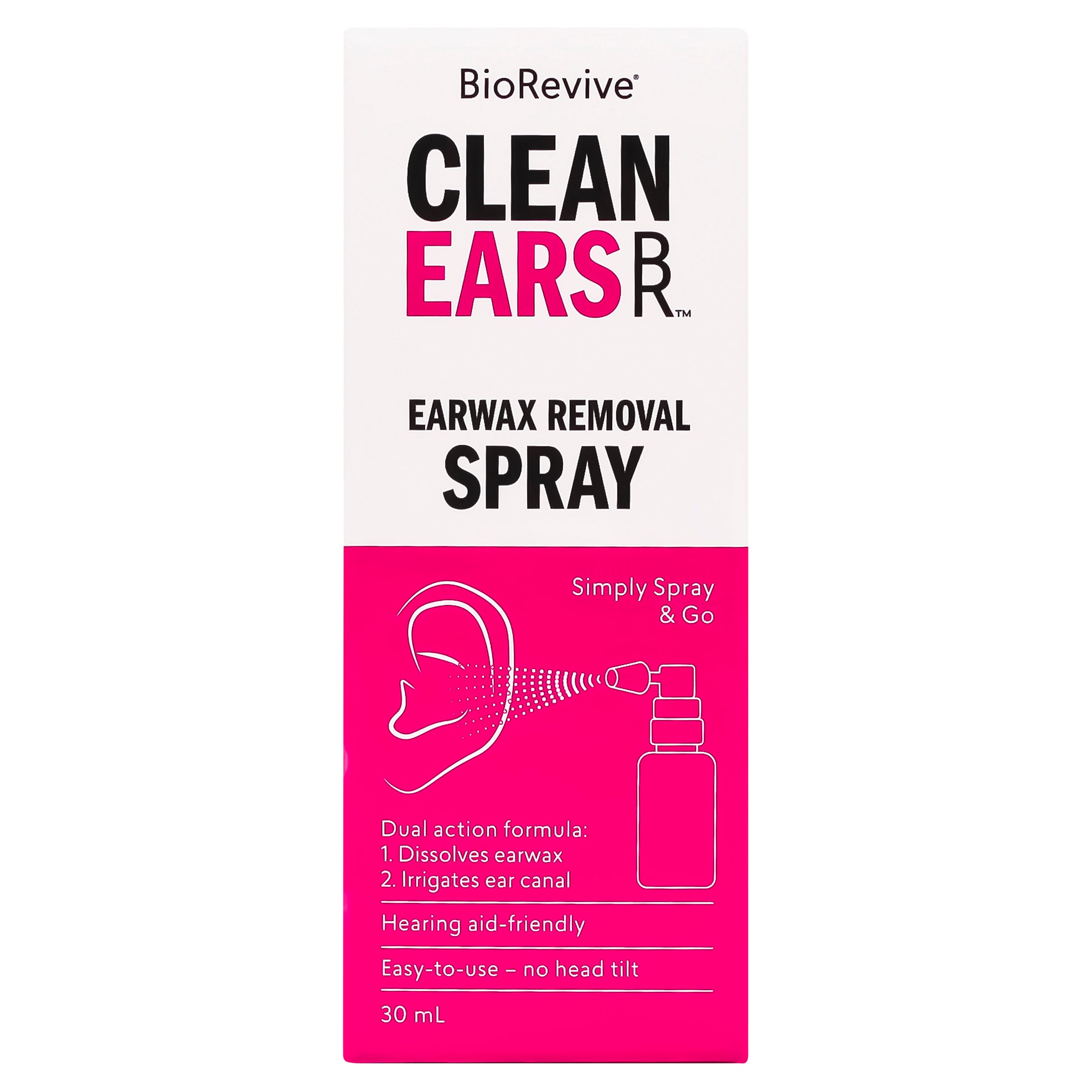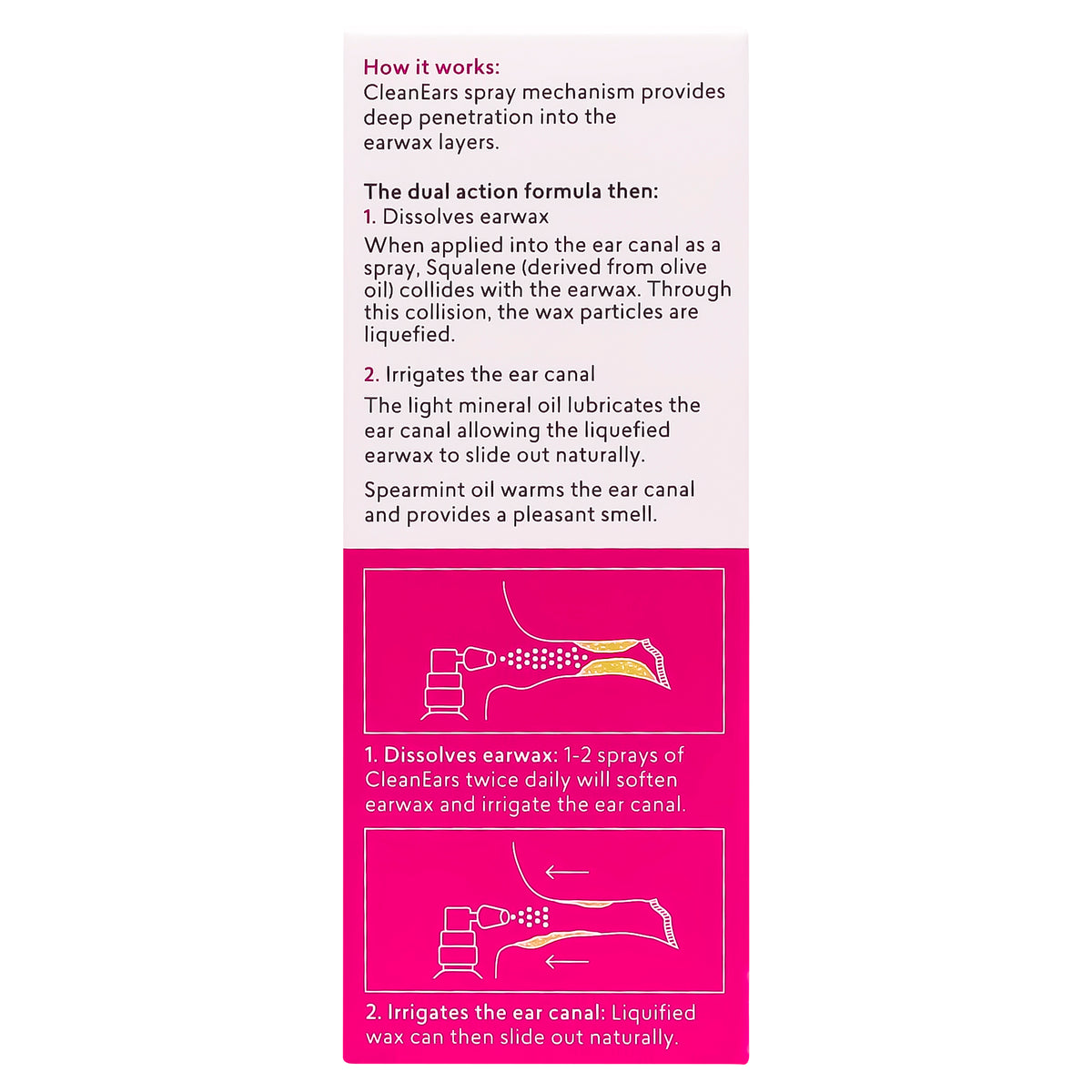CleanEars Wax Removal Spray 30ml, an all-in-one wax removal that gently prevents wax built up. Dissolves wax and irrigates the earBoxed Contents: 30g Spray Bottle