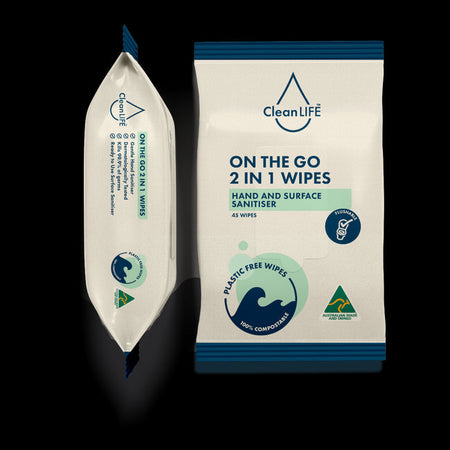 CleanLIFE On The Go 2 in 1 Wipe - sanitizing wipe to use on hands or surfaces for “must-have” moments when disinfecting is needed. Flushable grade wipes, are ideal for travel and everyday use or can be disposed of in general waste when dirty or soiled.